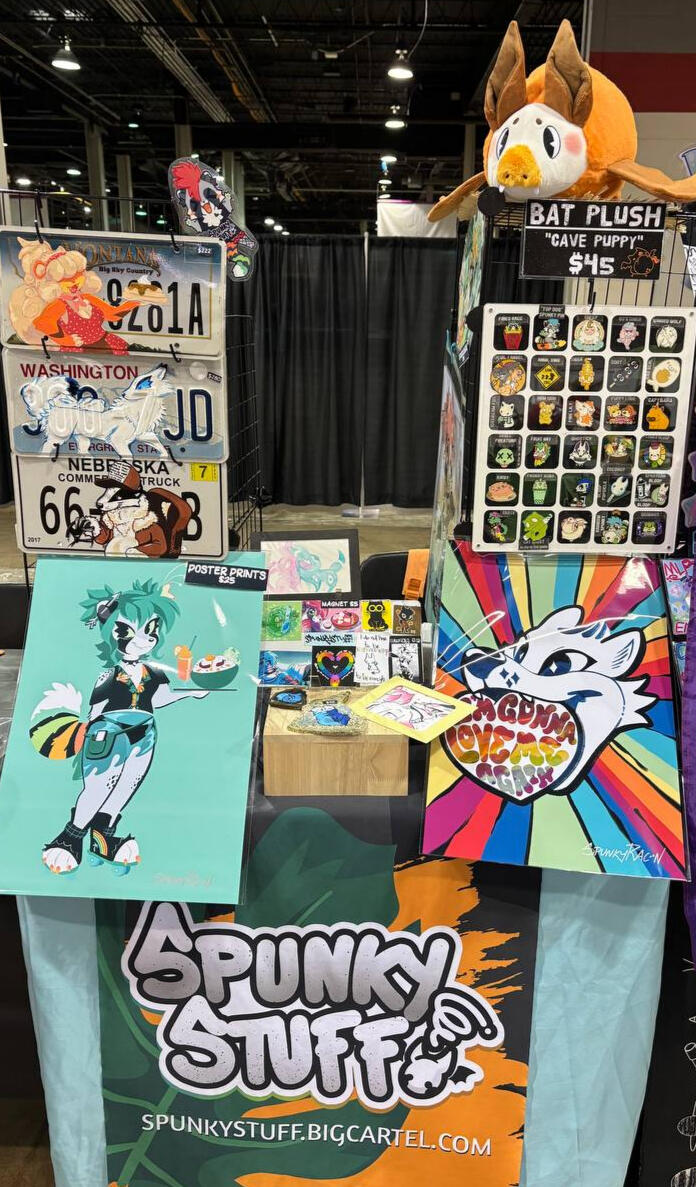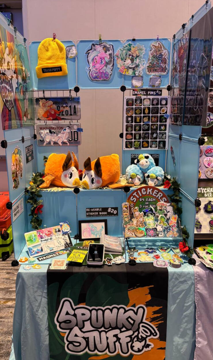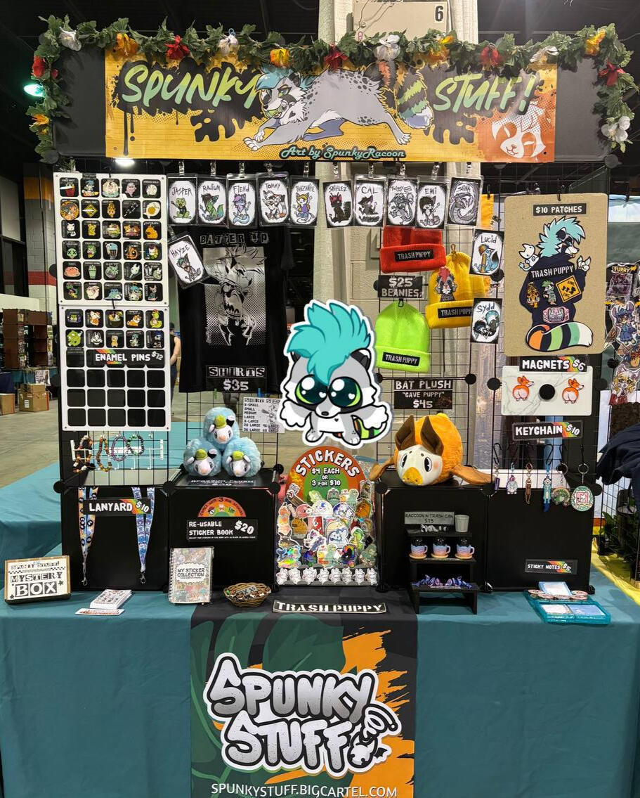 Catch Spunky Stuff! at conventions across the US! We love bringing LGBTQ+ & furry communities together through fun, artsy, punky wares. Our vending journey began in 2019 when Further Confusion opened our eyes to the Dealers Den world. Now, we value every new opportunity to share our art and creations with you wherever we can! SpunkyRacoon is a one man band who is always pumpin' out fresh new art. Our most popular items include high-quality stickers, enamel pins, patches, the comfiest beanies, and plushies. We hope to see you at your next event!